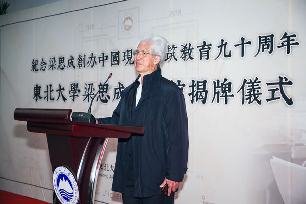 王建国院士致辞强调东南大学与东北大学有着深厚的历史渊源,在梁思成先生创立东北大学建筑系初期,曾经邀请东南大学建筑学系创始人之一的童寯先生共同为东北大学建筑教育出谋划策。他代表东南大学及众多高校学者向东北大学梁思成纪念馆的揭幕表示最诚挚的敬意,对数代前辈们为文化传承所做出的不朽贡献表达深深的敬仰之情。