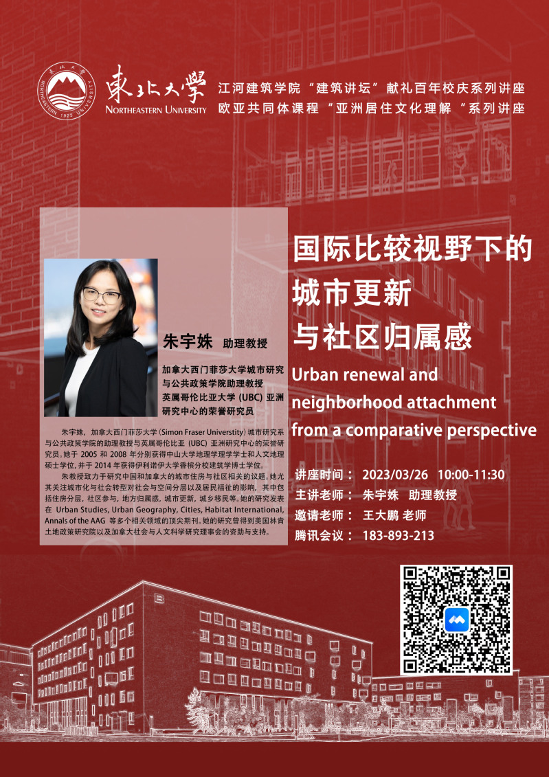 3月26日,应城乡规划系王大鹏老师邀请,加拿大西门菲莎大学(Simon Fraser University)城市研究与公共政策学院助理教授朱宇姝做客华体会官方版网站登录入口“建筑讲坛”(暨献礼百年校庆系列讲座),为我们做《国际比较视野下的城市更新与社区归属感》学术讲座,学院师生及国内同行80余人参加线上交流。