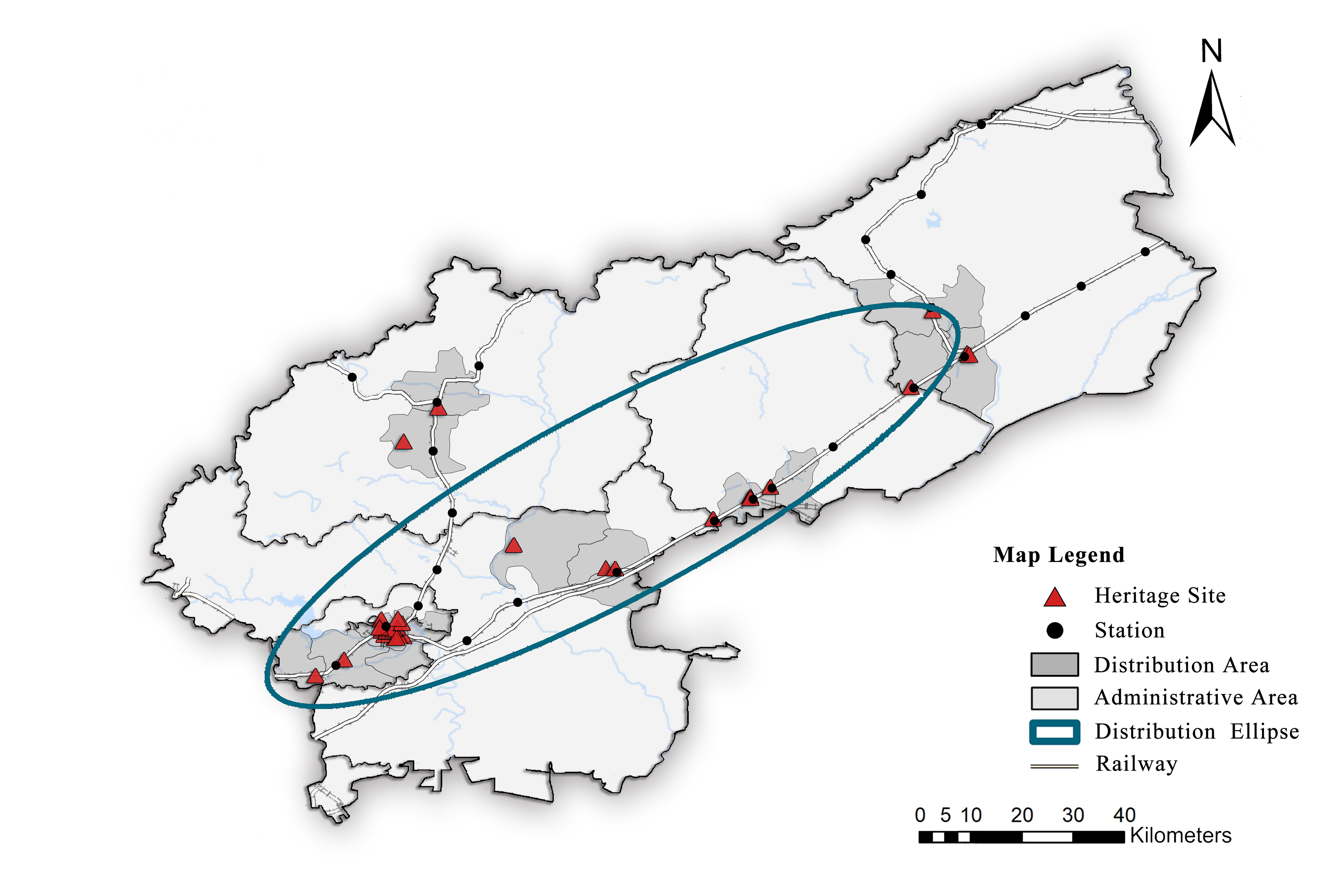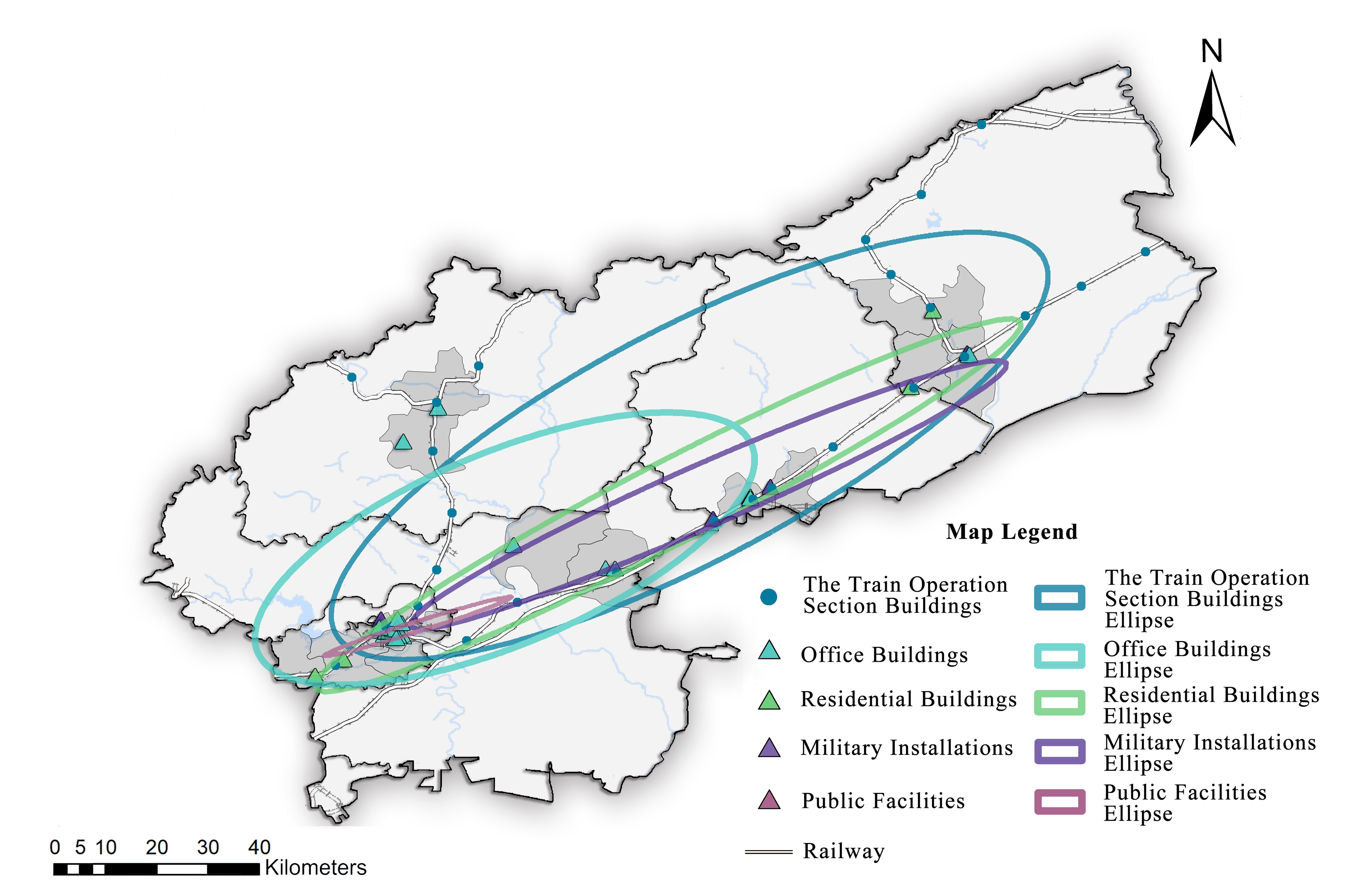 Standard deviation ellipse diagram of integral railway architectural heritage Standard deviation ellipse diagram of various types of railway architectural heritage in Jinzhou section