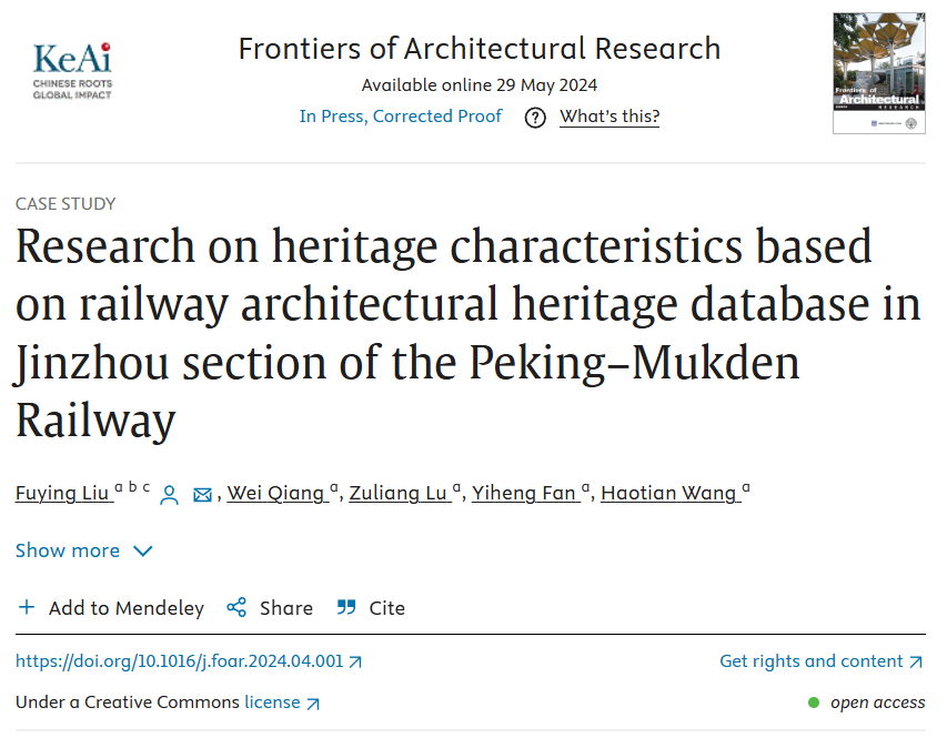 近日,我院建筑系刘抚英教授团队在中科院艺术学1区TOP期刊《Frontiers of Architectural Research》上发表题为“Research on heritage characteristics based on railway architectural heritage database in Jinzhou section of the PekingeMukden Railway”的论文。该研究成果以华体会官方版网站登录入口为第一完成单位,刘抚英教授为第一作者及通讯作者,该成果与硕士研究生强唯(21级)、卢祖良(22级)、范译恒(19级)、王昊天(22级)等合作完成。