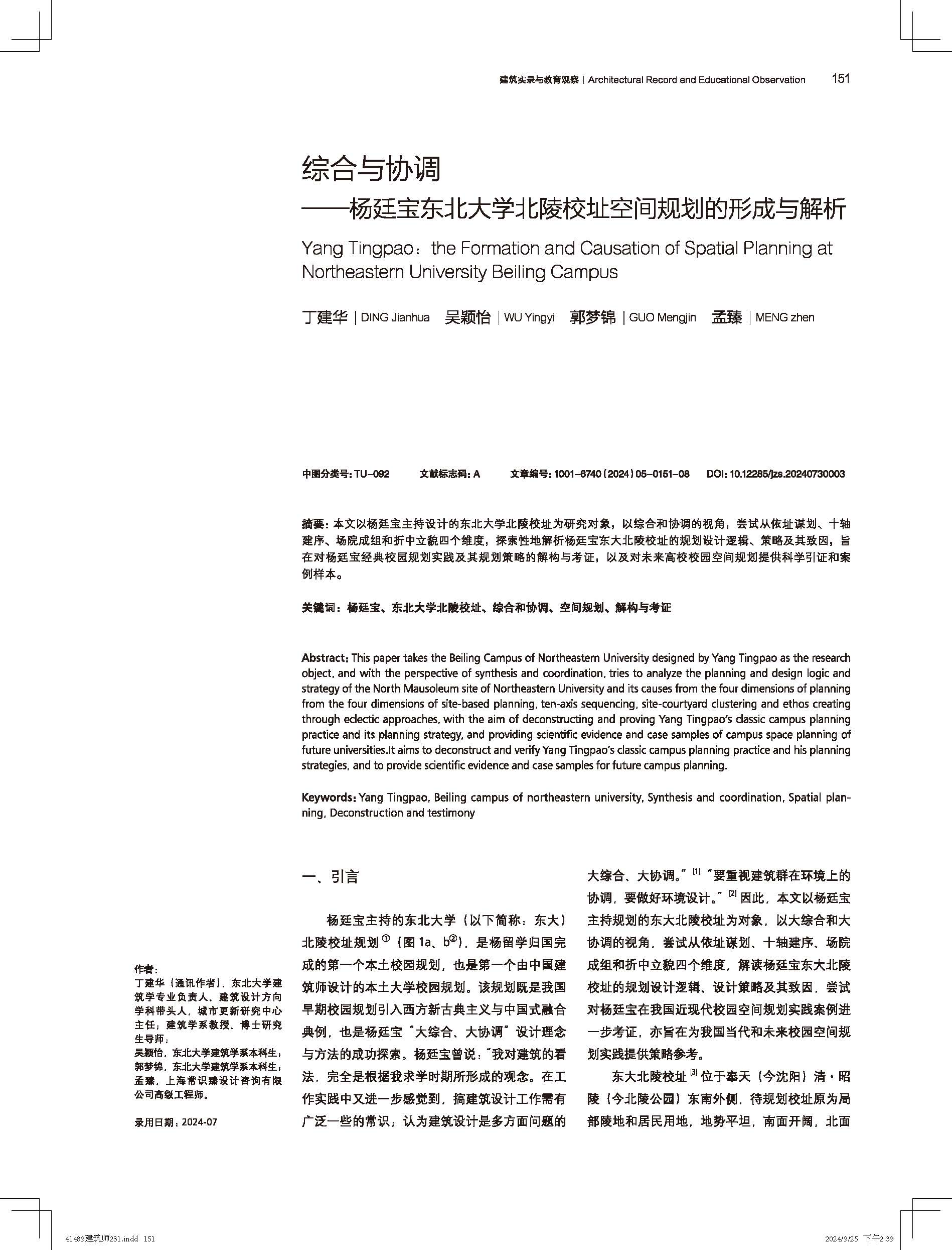 近日,我院教授丁建华及其团队在《建筑师》首个“行业实录与建筑观察”专栏连载两篇学术论文,分别为:《东北大学早期两阶段建筑学教育史略(1928-1956)》、《综合与协调——杨廷宝东北大学北陵校址空间规划的形成与解析》,两篇文章研究成果均以东北大学为第一完成单位,丁建华教授分别为独立作者和第一兼通讯作者,其中一篇,合作作者为吴颖怡、郭梦锦和孟臻高级工程师。